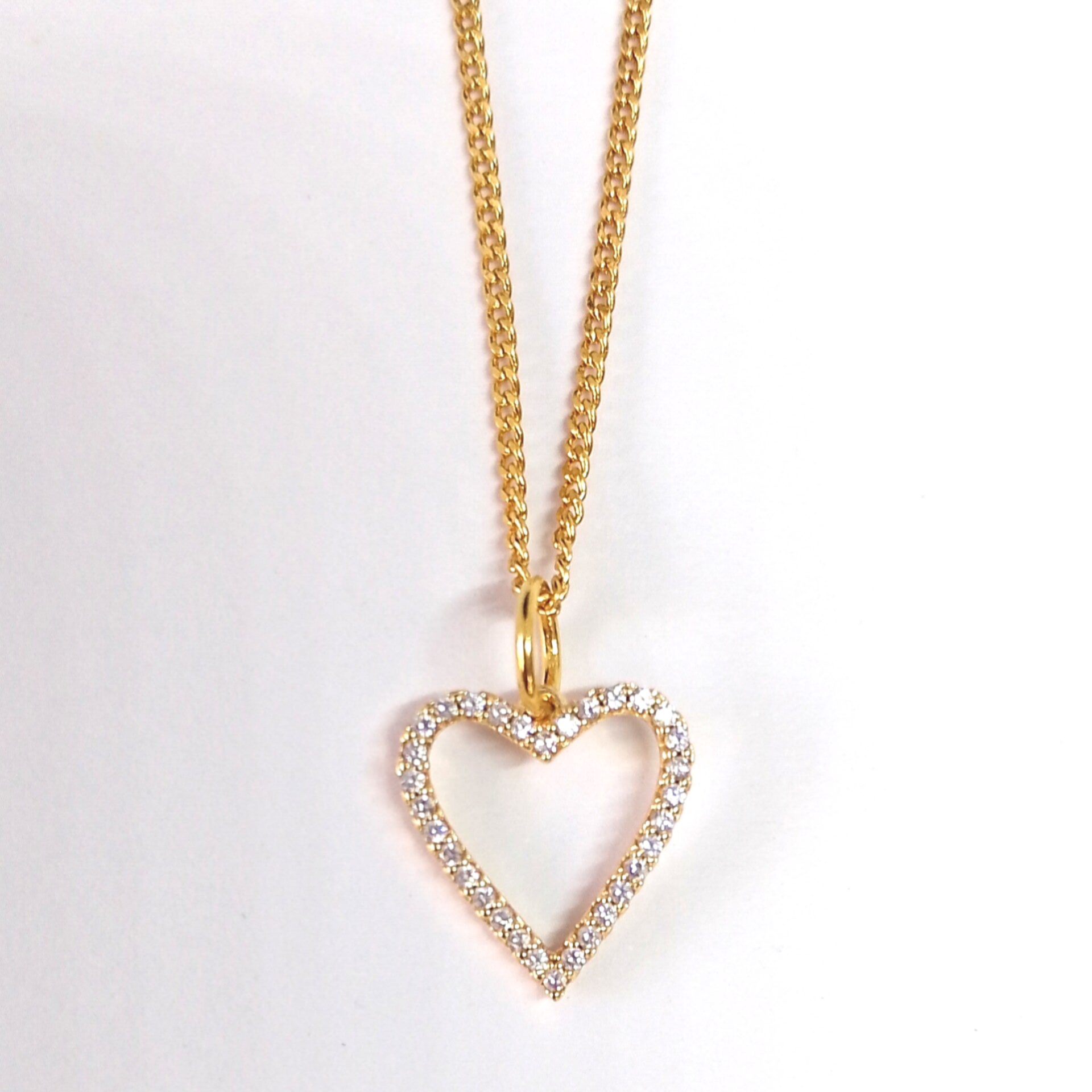 1.2mm wide, 14K yellow gold-filled cable chain, measuring 50cm in length. 1.3cm high, gold plated pave crystal heart.